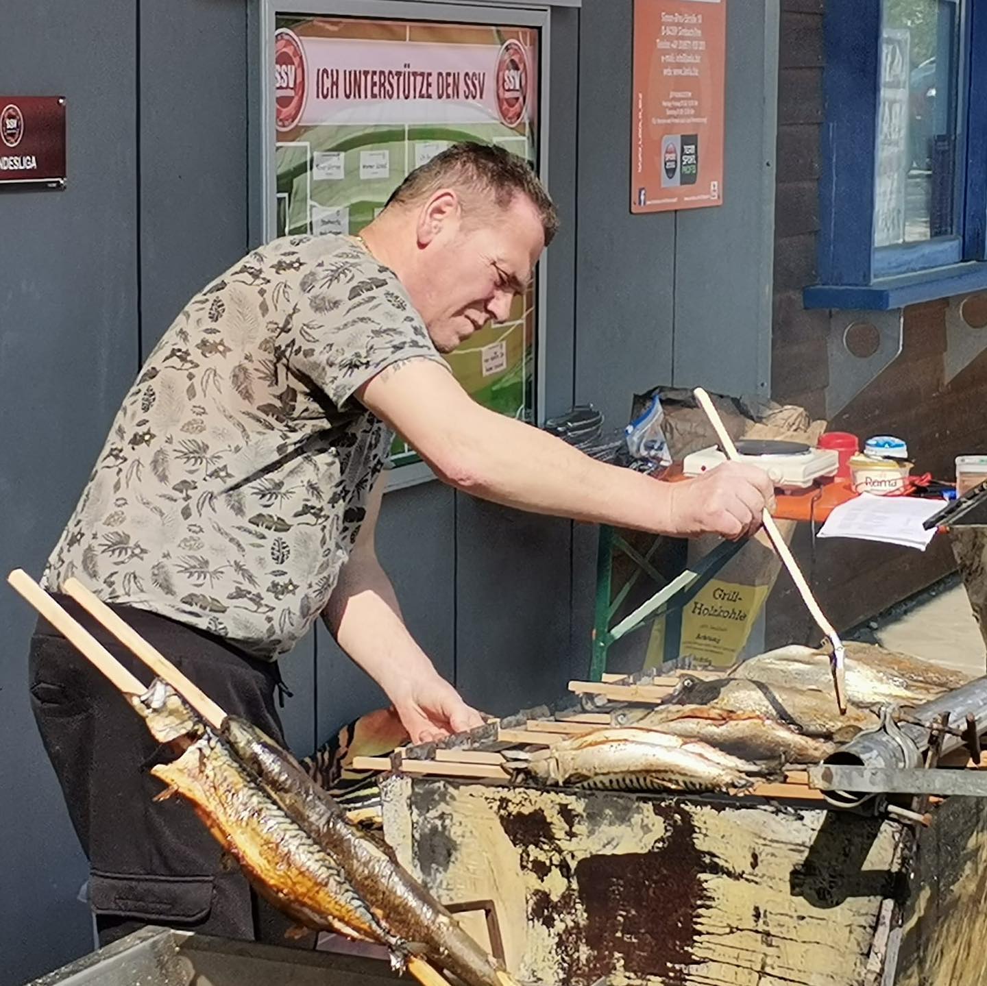 Für die Zubereitung der Steckerlfische konnte der SSV einen absoluten Profi gewinnen. Walter „Wack“ Clement kümmerte sich nicht nur im Vorfeld um das optimale Würzen und „Stecken“ der Fische, sondern grillte schließlich die Fische auch gemeinsam mit Bernhard Klarl in bester Fischbroda-Manier. „Wir als Verein sind überglücklich, dass wir so viele tolle Helfer, Fans und Mitglieder haben. Neben den beiden ‚Fischbrodan‘ haben auch noch viele weitere freiwillige, helfende Hände für diesen tollen Tag gesorgt, wofür wir enorm dankbar sind“, sagt der 1. Vorstand des SSV Xaver Gfirtner. Aber nicht nur Xaver Gfirtner war nach dieser Veranstaltung wunschlos glücklich, auch Walter Clement blickte am Ende des Tages mehr als zufrieden drein. Und das aus guten Grunde: denn alle vorbereiteten Fische wurden restlos verkauft.