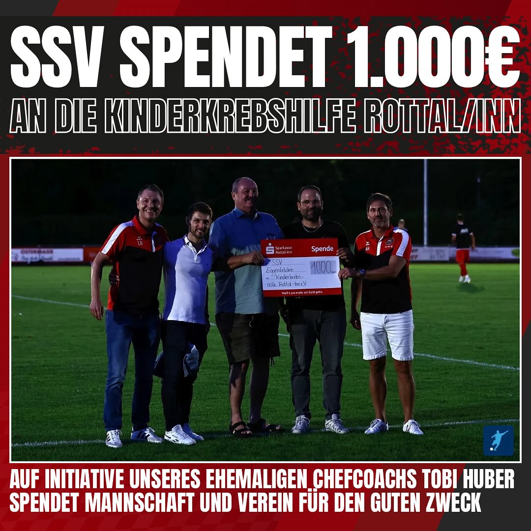 Auf Initiative unseres ehemaligen Cheftrainers Tobi Huber hat unsere erste Mannschaft letztes Jahr pro Gegentor 5€ aus der Mannschaftkasse für einen guten Zweck zur Verfügung gestellt. Unsere Vereinsführung hat die, sich daraus resultierende Summe aufgerundet, sodass am Ende der stolze Betrag von 1.000€ an Josef Hofbauer von der Kinderkrebshilfe übergeben werden konnte.